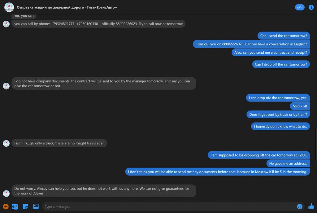I’ve sent them an email asking for a quote to send the car from Irkutsk to Saint Petersburg and I also tried reaching out on their Facebook page. I got two different quotes, one for 55000 RUB (~800 EUR) from Alexey on Whatsapp and one for 35000 RUB (500 EUR) from another guy, on Facebook Messenger. To be honest, I didn’t know what to think of it, it looked like a scam. The guy on Messenger even said “Do not worry. Alexey can help you too, but he does not work with us anymore. We can not give guarantees for the work of Alexei”. Which one is the real thing and why did Alexey have access to my email in the first place?